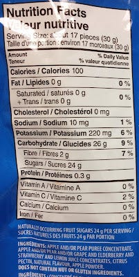 Before reading the tweets, have a peek up above at the nutritional information for SunRype fruitsource bites which per recommended serving have 6 teaspoons of sugar, bite per bite double the sugar of nibs, and they don't contain the vitamin C of even one lonely actual strawberry.